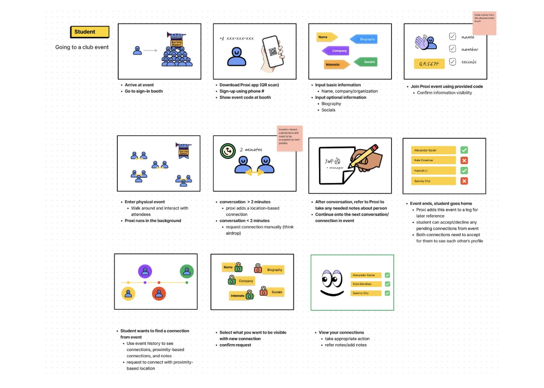Interviews and surveys helped us understand our target audience, their event networking strategies, and their pain points. Using insights we gathered from our user research, we storyboarded how our solution could facilitate networking at events.