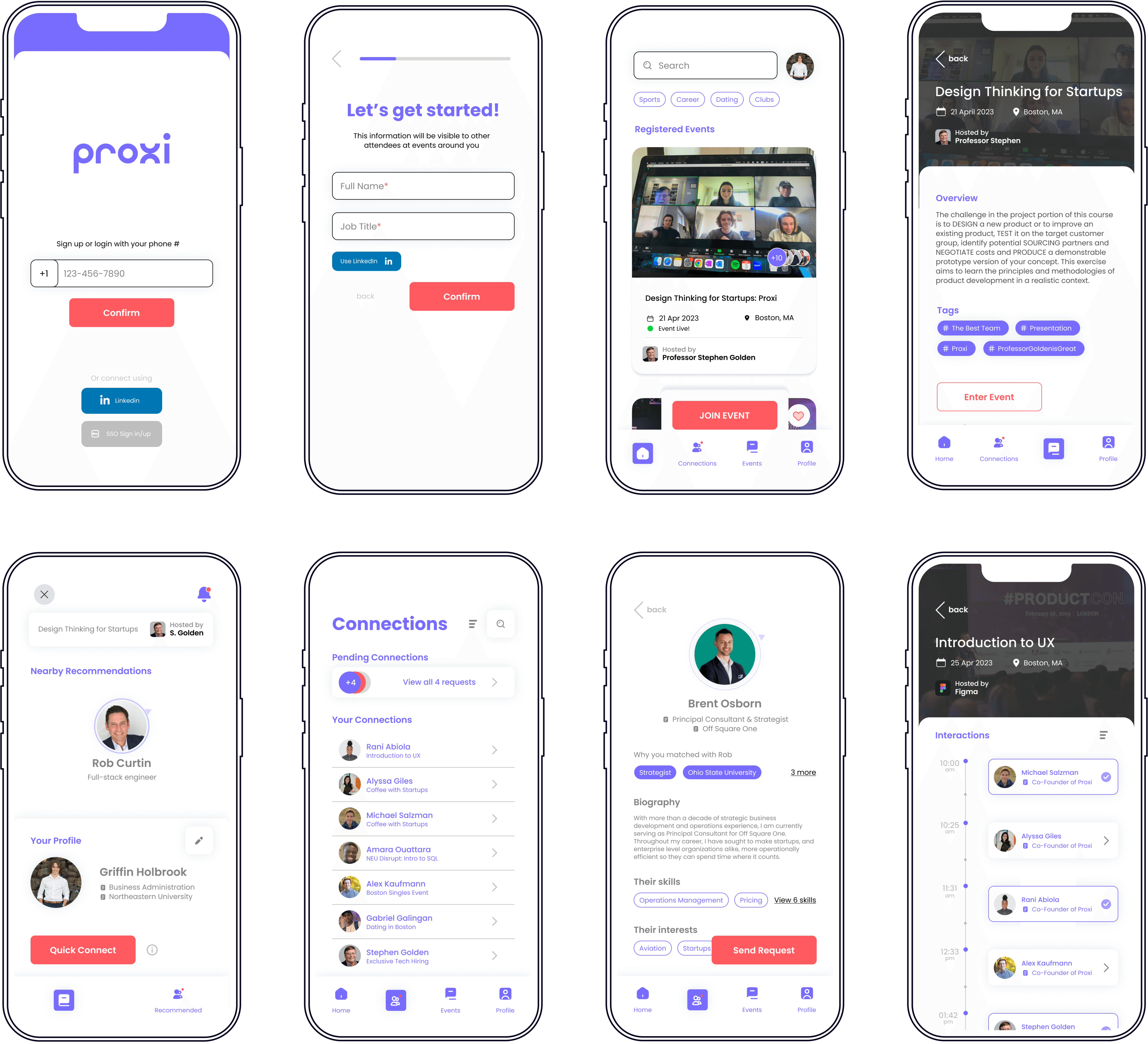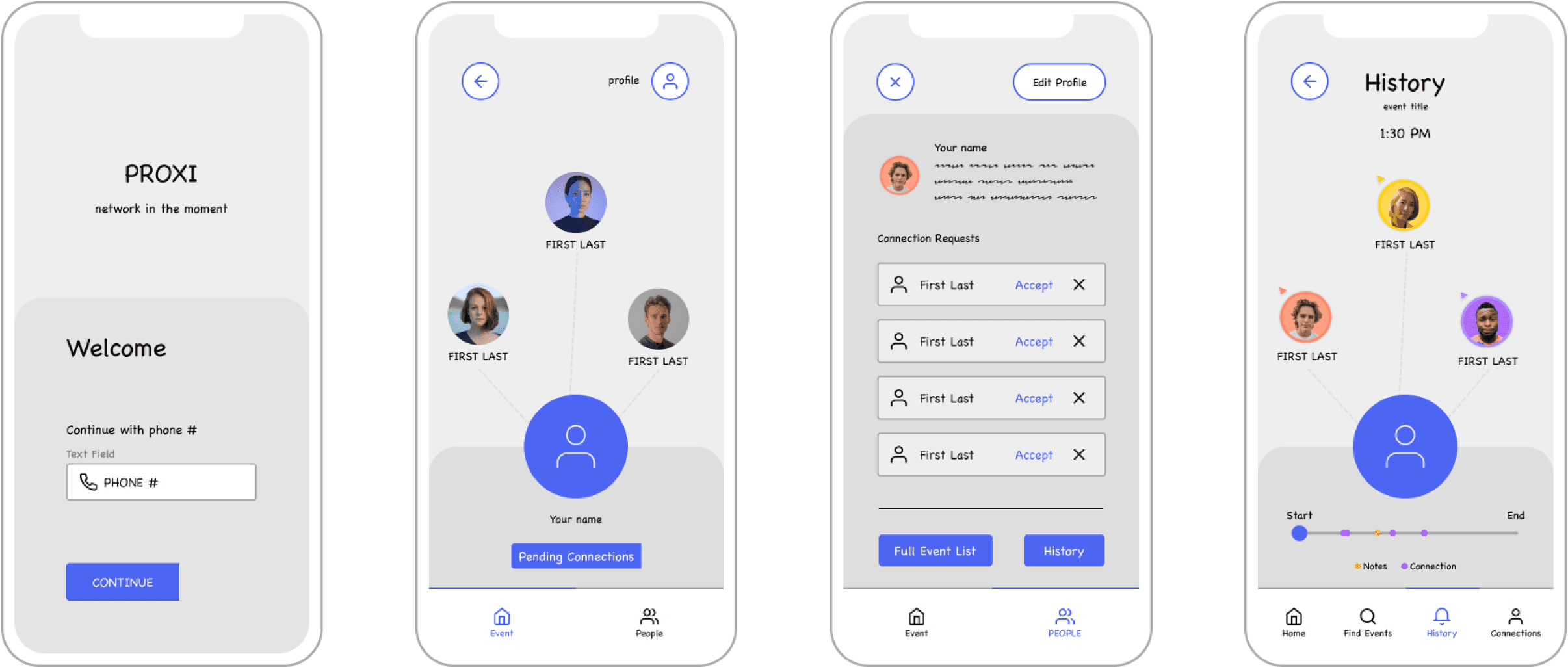 After the initial validation of sketches, we created an interactive wireframe prototype capturing the core functionality of Proxi.
